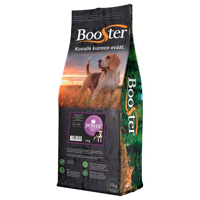 Lihaisa (lihapitoisuus 45%) Booster Power on erinomainen metsästyskauden ruoka paljon energiaa tarvitsevalle metsästyskoiralle. Runsaan rasvakoostumuksensa ansiosta Booster Power on myös mainio ruoka harrastuskoiralle erityisesti kilpailu- ja intensiivisellä harjoittelukaudella. Booster Power on myös ihanteellinen työkoiran ruoka ja tukee mm. valjakkokoiria ja virkakoiria vaativissa ja tärkeissä tehtävissään.