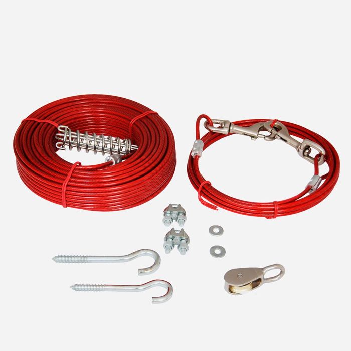 Vahvaa ja kestävää, muovipäällysteistä vaijeria. Mukana 3 m pitkä talutinosa, jonka molemmissa päissä on pistoolilukot. Asennuskohteesta riippuen tarvitset muutamaa perustyökalua juoksunarun asentamiseen, muutoin pakkauksessa on kaikki tarvittava, myös kiinnityskoukut. Pakkauksessa asennusohje.