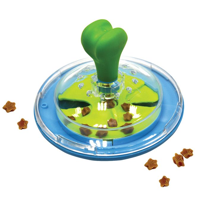 Helposti pienikokoisilla makupaloilla ladattava hyrrä tarjoaa viihdettä koiralle pitkäksi aikaa tarjoilemalla herkkuja koiran - tai omistajan - pyöritellessä ja heitellessä lelua. Hyrrän sisäosan vihreässä levyssä olevien avattavien namisektoreiden kokoa voi joko kasvattaa tai pienentää halutun vaikeusasteen mukaiseksi. Koira näkee makupalat hyrrän sisällä läpinäkyvän muovikannen läpi, mikä kasvattaa motivaatiota saada namit ulos. Hyrrä on valmistettu kestävistä synteettisistä ja turvallisista materiaaleista ja se sopii kaikille koirille.