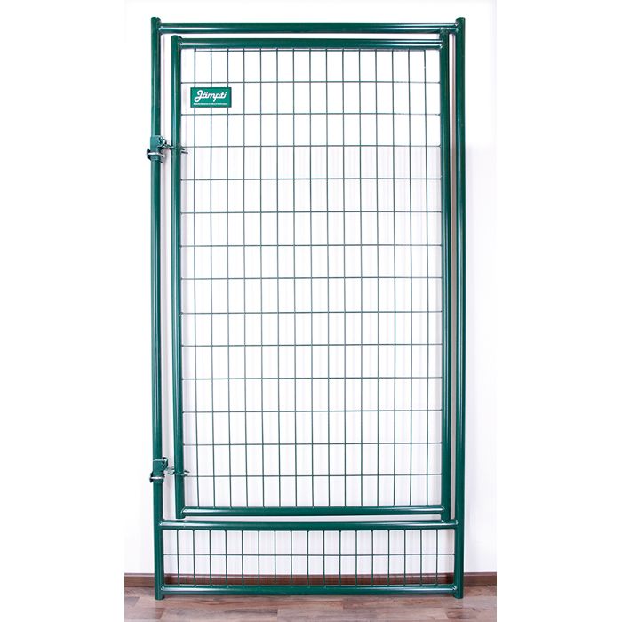 Asiakkaiden toiveesta valmistettu ovielementti reilummalla, 93 cm leveällä oviaukolla (kokonaisleveys 100 cm). Ovesta mahtuu helposti kottikärryt, ruohonleikkuri ja muut leveät kuljetukset. Ovielementtiä voidaan käyttää Jämpti Pro MEDI Sinkityn+maalatun tarhan ovena (valitse tällöin sen pariksi Jämpti Pro MEDI Sinkitty+maalattu tarhaelementti 1,0 m levyisenä), mutta myös kotitekoisten, verkkorullasta valmistettujen tarhojen oviaukkona. Tämä vaatii reikien poraamista raamiputkeen puukehykseen ruuvaamista varten. Ovi voidaan kiinnittää myös rakennuksen seinään erillisten seinäkiinnikkeiden avulla (Jämpti Pro Seinäkiinnike, sinkitty). Ovielementti leveällä ovella on kätevä myös sisätiloihin rakennettujen aitausten yhteydessä, esim. kenneltiloissa. Elementin kanssa toimitetaan kaksi kiinnikettä. Kiinnikkeitä on saatavana lisää erikseen. Elementin ovi aukeaa sekä sisään- että ulospäin. Ovessa on kaksi lukkoa jotka ovat avattavissa ja suljettavissa molemmin puolin tarhaa. Jämpti Pro Sinkittyjen+maalattujen tarhaelementtien materiaali on sinkittyä ja jauhepolttomaalattua terästä, joten niistä valmistettu tarha on kestävä ja näyttävä. Verkon materiaalivahvuus on markkinoiden vahvin, 4 mm, mikä pitää verkon jämäkkänä. Ohuempi verkkolanka voi aiheuttaa verkon venymisen ja löystymisen koiran esimerkiksi hyppiessä sitä vasten.. Elementtien jokainen lanka on kiinnitetty hitsaamalla kehään, mikä poikkeaa markkinoilla olevista ruuvatuista tai niitatuista elementtimalleista. Elementin kehä on halkaisijaltaan 32 mm pyöröputkea, minkä ansiosta tarhan muoto ei rajoitu pelkästään neliön muotoon vaan voit rakentaa minkämuotoisen tarhan tahansa! Elementtien kiinnitys toisiinsa on erittäin helppoa, tarvitset vain yhtä työkalua (räikkäavain). Elementin mitat: