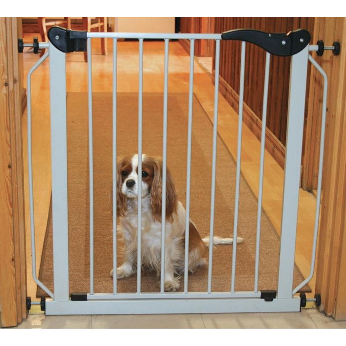 Tukeva metallinen portti lemmikkikotiin. Tyylikäs vaaleanharmaa portti on nopea kiinnittää ja irrottaa oviaukosta. Kulkeminen portista on sujuvaa: portin lukkomekanismin saa avattua yhdellä kädellä. Portti aukeaa molempiin suuntiin.
