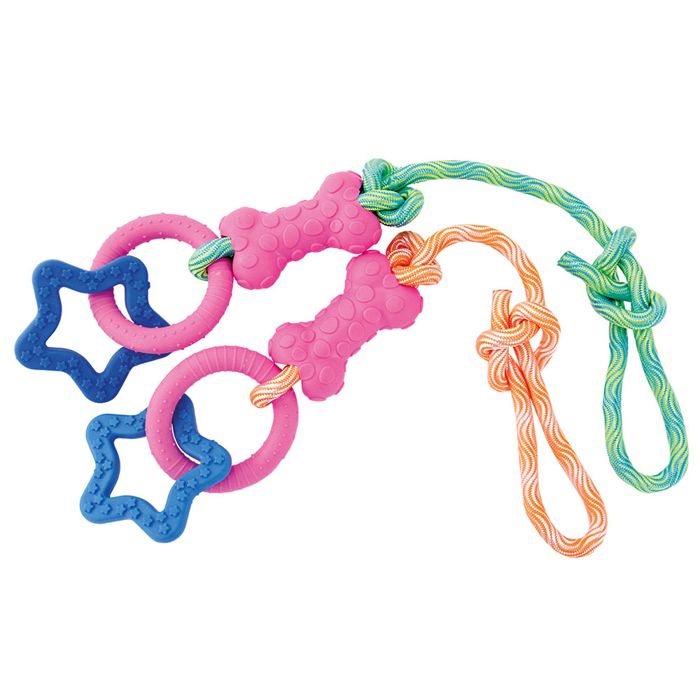 Hypnoottisin kuvioin koristeltuun köyteen on pujotettu kuminen luu, jota seuraavat nystyräinen kumirengas sekä kohotähtikuviolla koristeltu kumitähti. Hammaskalustoa kutkutteleva lelu sopii erityisesti pienen ja keskikokoisen koiran vetoleikkeihin.