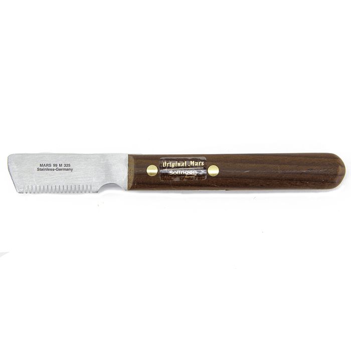 Terävällä hammastuksella varustettu trimmausveitsi soveltuu erityisesti terrierin karkean karvan trimmaukseen.