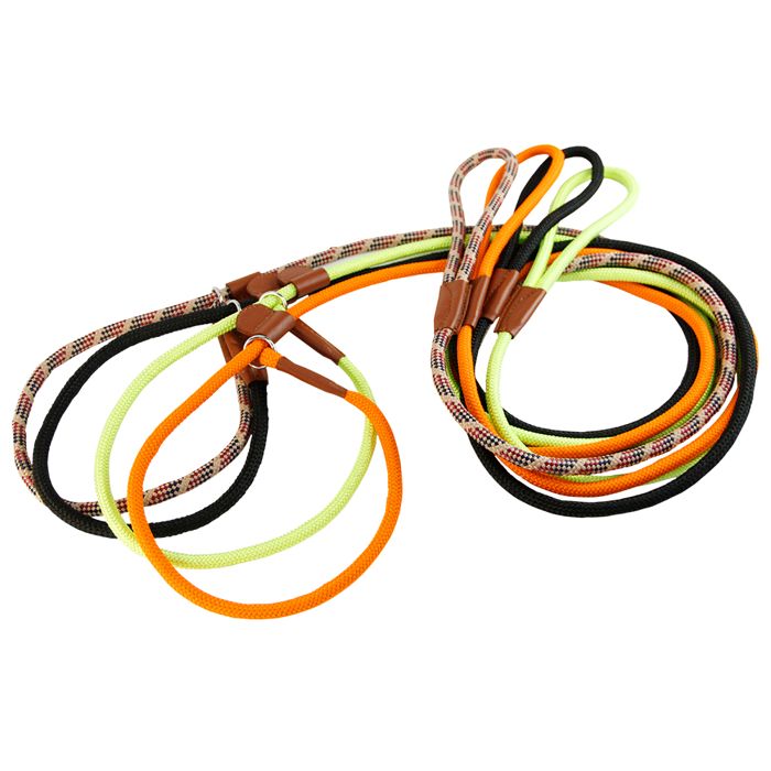 Pyöreästä nylonista valmistettu pitkä noutajatalutin. Taluttimen pinta on mukavan sileää nylonpunosta. Soveltuu päivittäiseen käyttöön, metsästykseen ja harrastuksiin. Liukuva keinonahkastoppari kaulainlenkin pituuden säätöön. Keinonahkavahvike taluttimen ja käsilenkin liitoskohdassa. Pannan O-rengas kirkasta metallia.