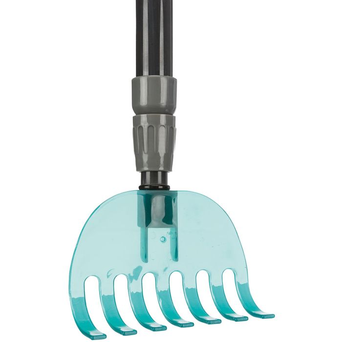 Kumartua ei tarvitse edes työkalujen poimimista varten, sillä siivoussetti seisoo pystyssä kihvelin varassa. Haravalle on oma kiinnike kihvelin varressa.