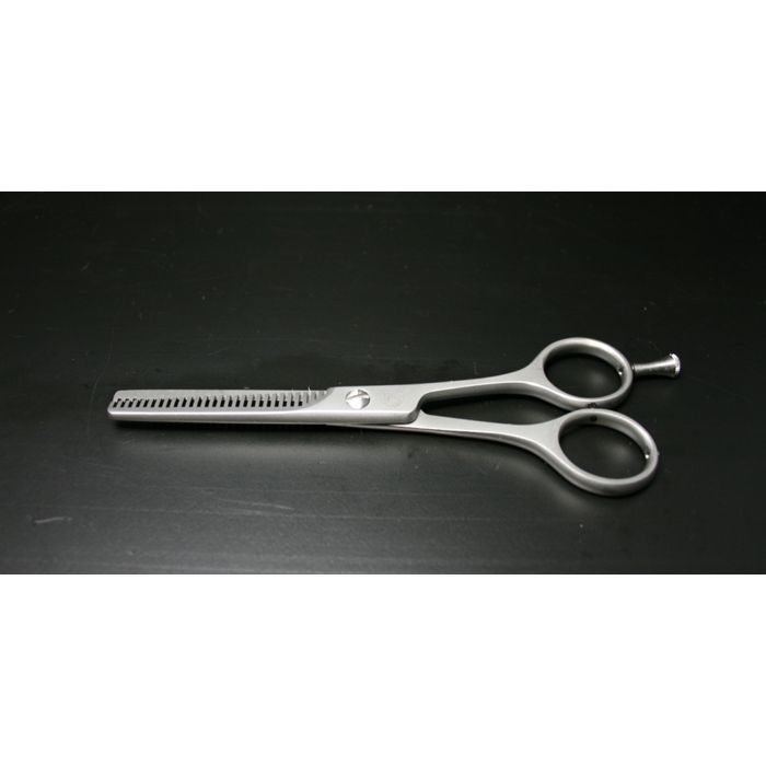 Kaksipuoleiset ohennussakset ruostumattomasta teräksestä. Irrotettava sormituki. 30 hammasta. Kokonaispituus 14,5 cm. Matta metalli.