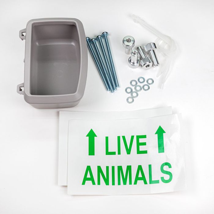 Pakkaus sisältää oven ritilään asennettavan kupin, pultit, sekä kuljetusboksiin lisättävät "Live animals" -tarrat.