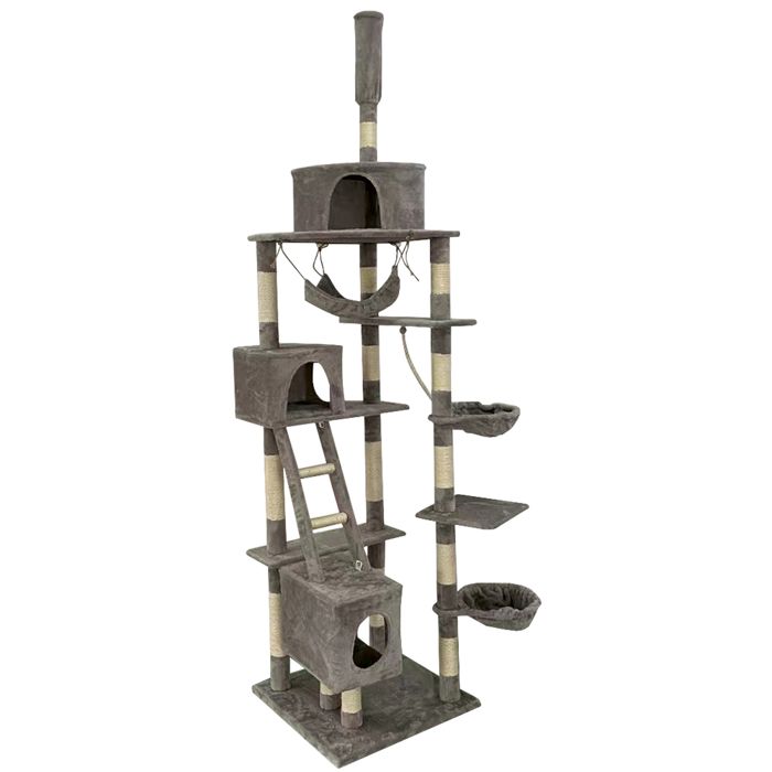 Kiipeilypuu voidaan pingottaa lattian ja katon väliin huipun kangaspeitteisen säätöosan avulla. Korkeus voidaan säätää välille 225-255 cm. Ennen kiipeilypuun käyttöön ottamista suosittelemme varmistamaan lisäkiinnityksen tarpeen erityisesti, jos omistat kookkaita tai hyvin riehakkaita kissoja tai jos lattiamateriaali kiipeilypuun alla on liukas. Tue kiipeilypuu tarvittaessa kiinnittämällä se seinään tai pingota naruilla / liinoilla kiinteiden kohtien väliin.