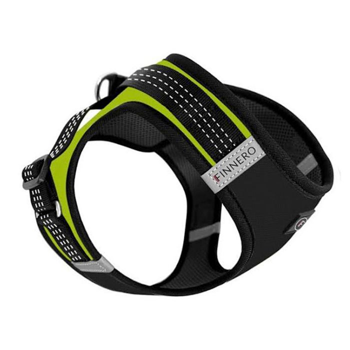 Keltainen huomioväri selkäpuolella ja heijastintikkaus kaikissa nylonnauhoissa auttaa parantamaan näkyvyyttä pimeässä. Liivivaljaan vatsaosa on musta ja likaa hylkivää materiaalia. Säänkestävistä materiaaleista valmistettu valjas kuivuu nopeasti ja on taas pian valmis uuteen ulkoiluhetkeen.