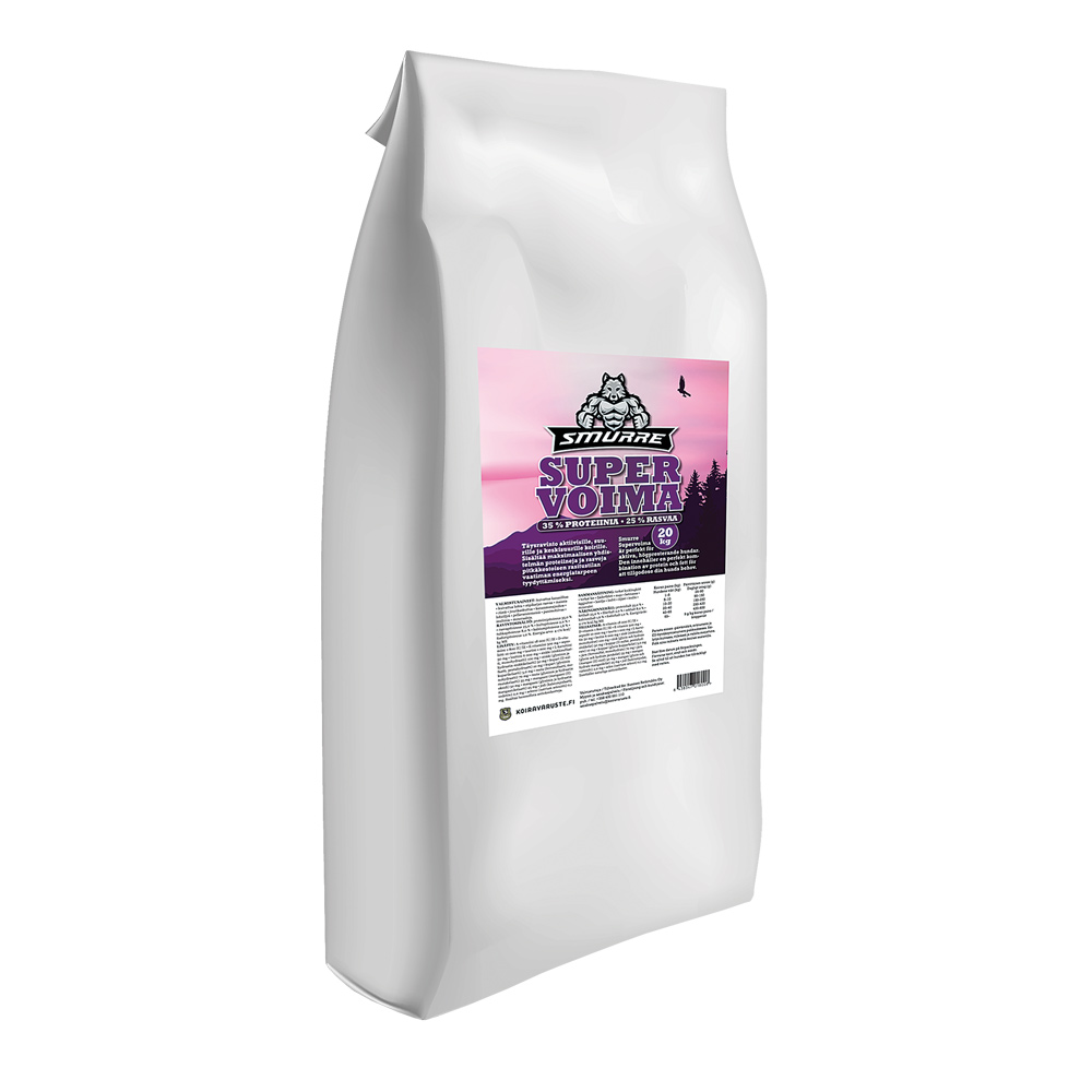 Smurre Supervoima on korkealaatuinen, vehnätön ja erittäin energiapitoinen täysravinto, suunniteltu erityisesti metsästyskoirille sekä työkoirille, joiden energiantarve on suuri.