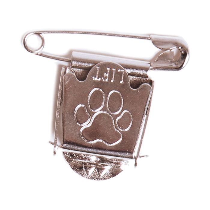 Perinteinen hakaneulalla kiinnitettävä kirkas metallipidike kilpailunumerolle. Leveys n. 2 cm.