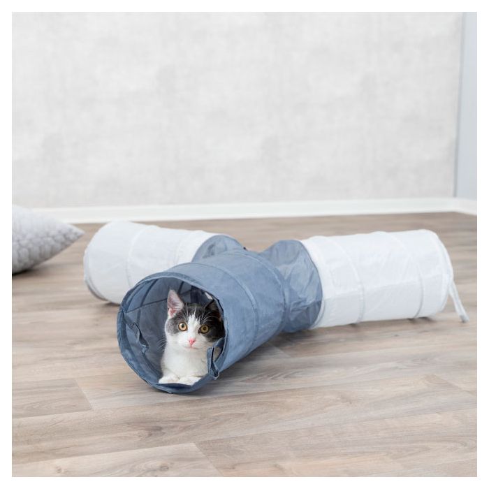 Neljällä kulkuaukolla varustettu tunneli on valmistettu kulutusta kestävästä nylonista. Spiraalijousi pitää luolaston kasassa myös vauhdikkaimpien rallien alla! Hauskuutta riittää sekä kissoille että koiranpennuille.